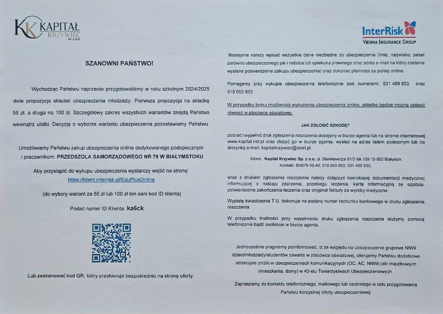 przedstawiamy propozycję ubezpieczenia dzieci. Wewnątrz zamieszczonych ulotek znajdziecie Państwo szczegółowy zakres ubezpieczeń i ich wariantów.