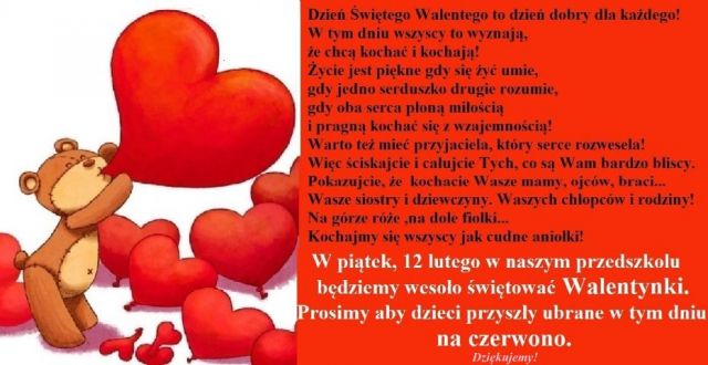 Walentynki w Konwaliowym Zakątku obchodzić będziemy 13 lutego tj. piątek zachęcamy, aby w tym dniu dzieci do przedszkola przyszły ubrane w odcieniach czerwieni i różu. Ponadto od poniedziałku w holu przedszkolnym stanie „walentynkowa skrzynka” do której wrzucać można walentynkę dla wszystkich których darzymy sympatią (kolegi, koleżanki, Pani) - Skrzynka będzie stała do 12 lutego (czwartek)