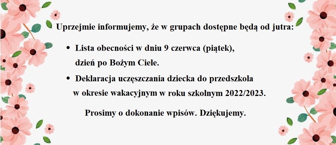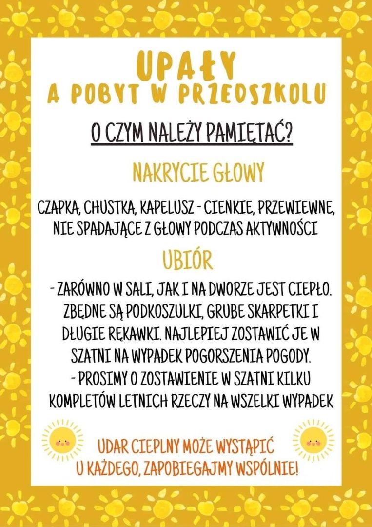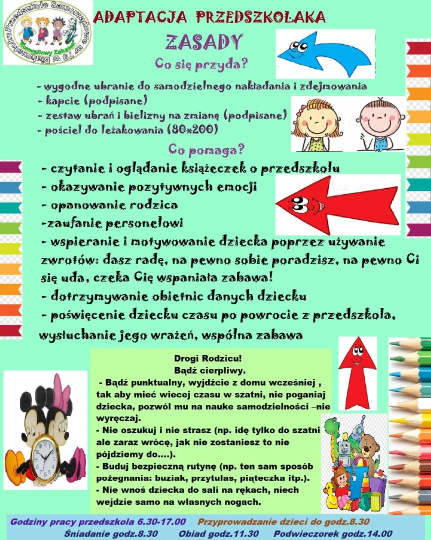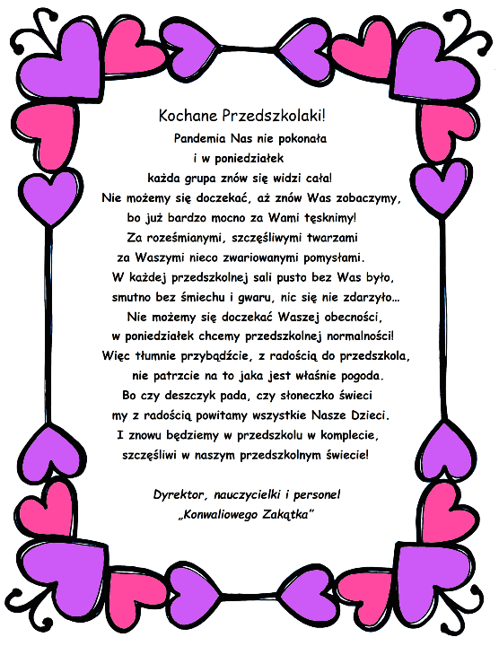 W związku z zasadami zapobiegania epidemii czekają Państwo na odbiór dziecka przed placówką. Przedszkolaki po zajęciach zostaną sprowadzone do szatni . Pani woźne będą wzywały po odbiór pociechy (dbając o limit osób przebywających w szatni) i dopiero wtedy wchodzą Państwo do szatni.