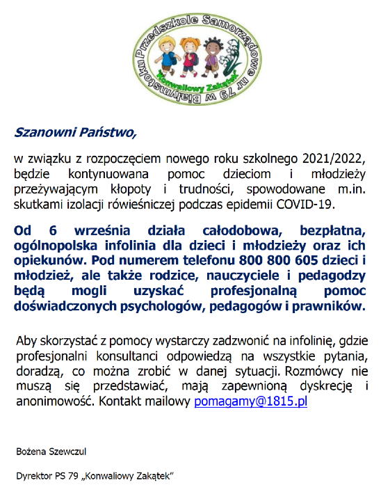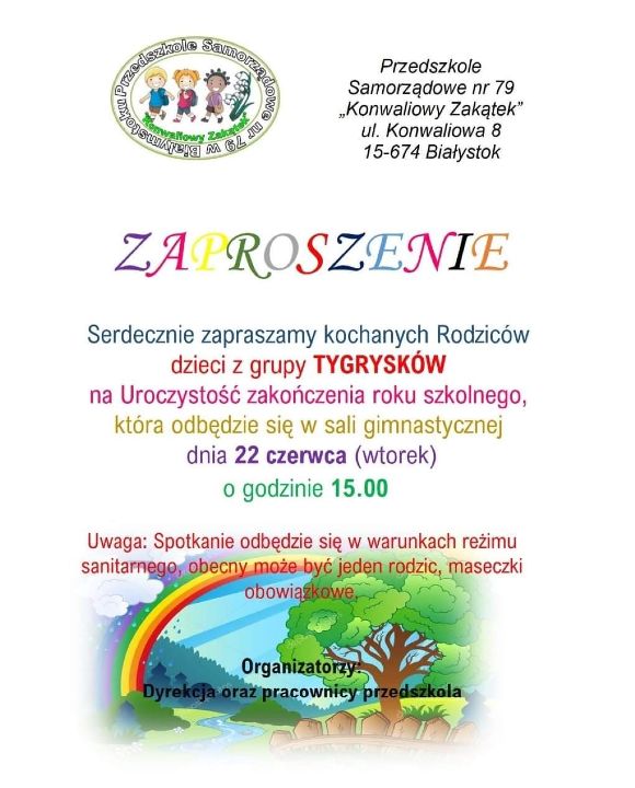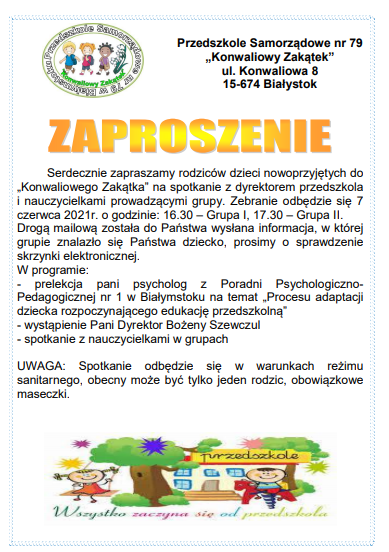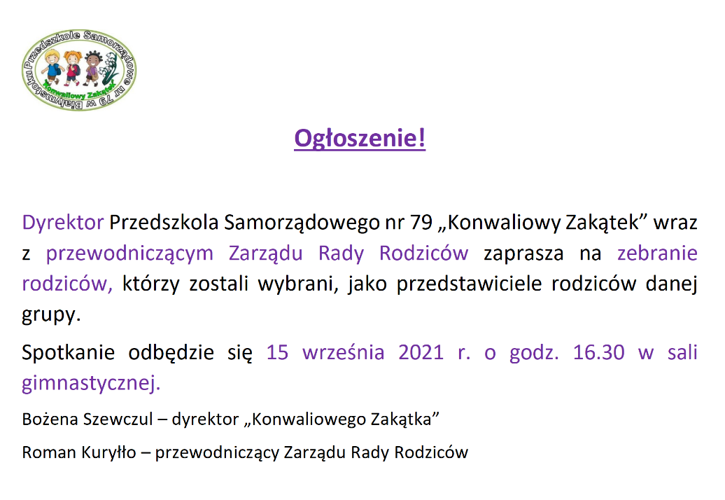 Dyrektor Przedszkola Samorządowego nr 79 „Konwaliowy Zakątek” wraz z nauczycielkami zaprasza rodziców dzieci uczęszczających do przedszkola na zebranie organizacyjne w związku z początkiem roku szkolnego 2025/2026.