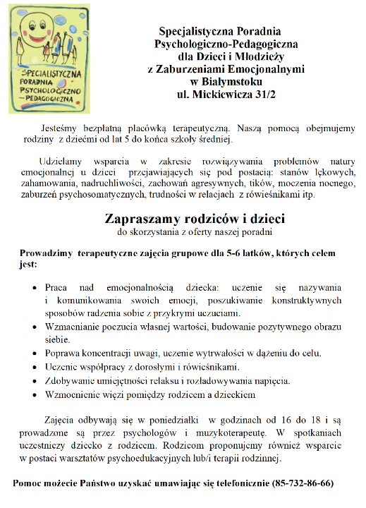 Informujemy, że od listopada 2025 r. do maja 2026 r. w Poradni Psychologiczno-Pedagogicznej Nr 1 w Białymstoku działa Specjalistyczny Punkt Konsultacyjny, w którym dyżurują specjaliści – psycholodzy, pedagodzy, neurologopeda – otwarci na udzielanie pomocy psychologiczno-pedagogicznej zarówno nauczycielom, rodzicom jak i dzieciom.