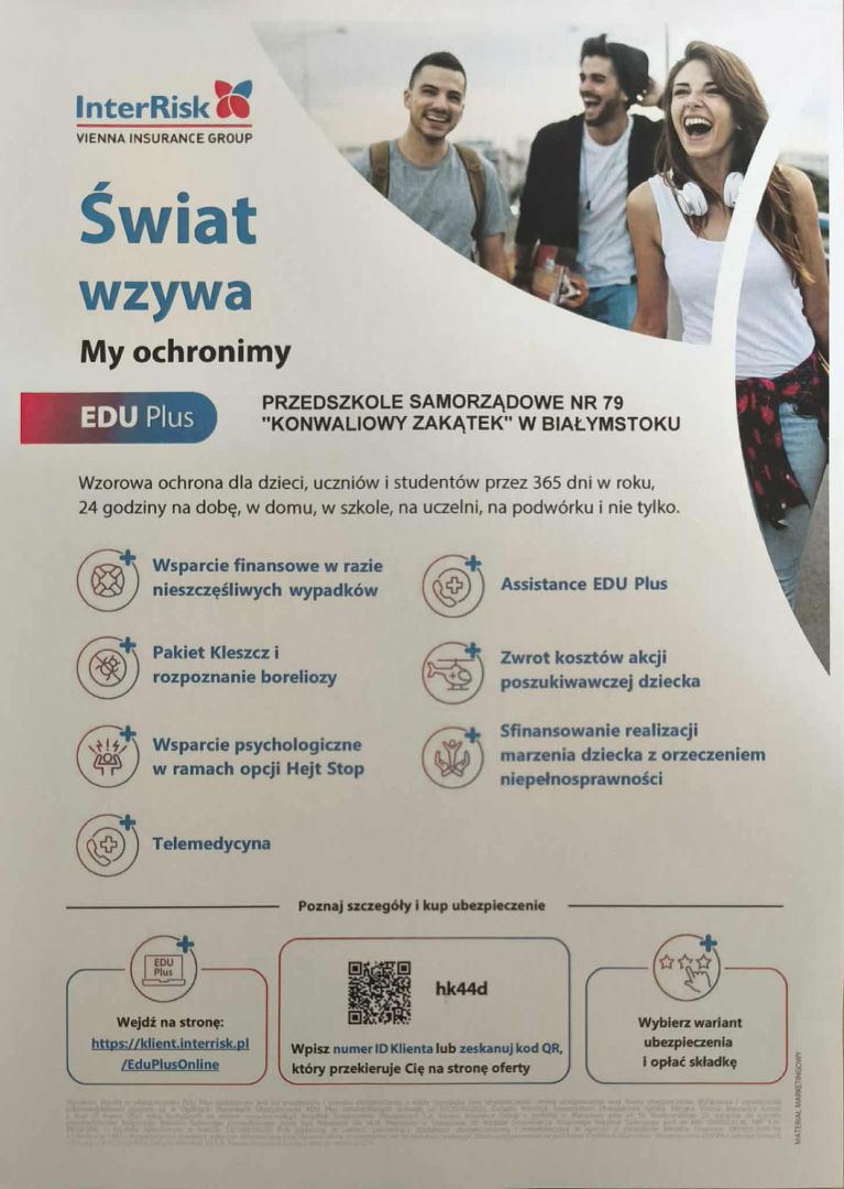 Zbliża się termin zakończenia wpłat  na ubezpieczenie dzieci  od NNW. Do 30.09.2020 r. mogą Państwo ubezpieczyć dziecko, jest to wpłata dobrowolna.  Szczegóły ubezpieczenia znajdą Państwo we wpisie z 4 września na stronie internetowej przedszkola.