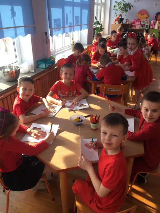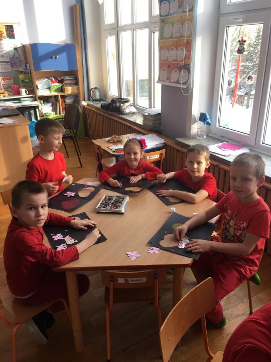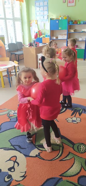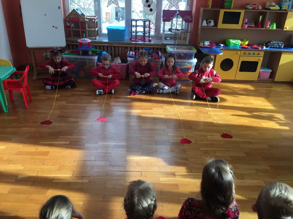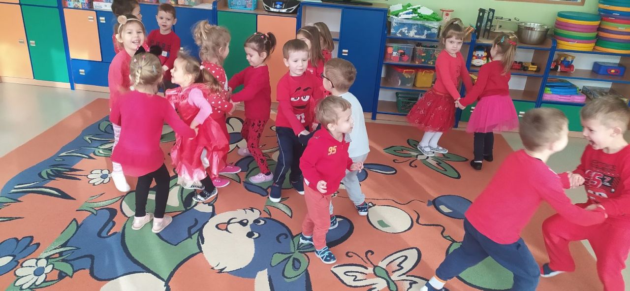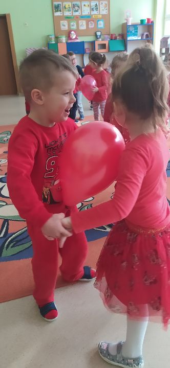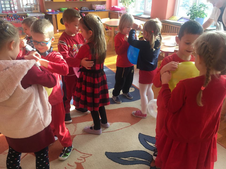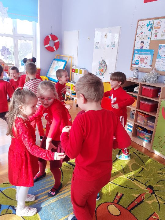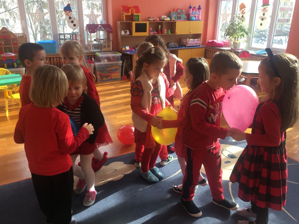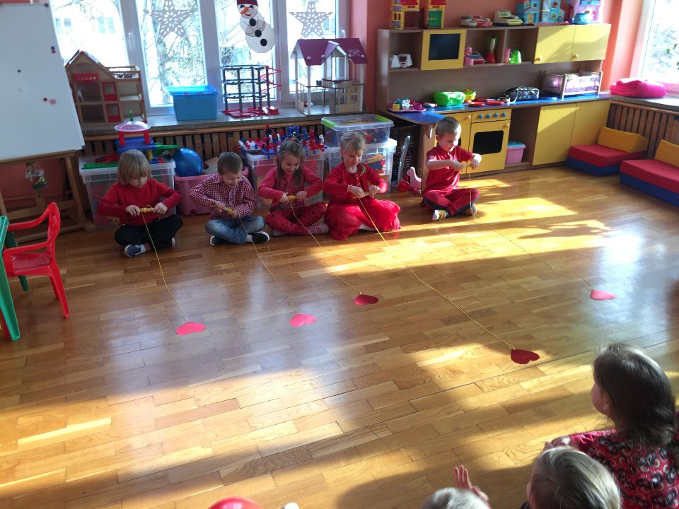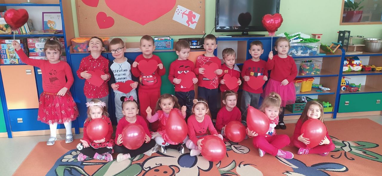 Jak co roku o tej porze, dzieci z całego przedszkola kultywowały tradycje walentynkowe. W pogodnej atmosferze i radosnym nastroju obchodziły ten dzień bardzo przyjemnie. Na początku zostały zaznajomieni ze zwyczajami walentynkowymi, ich historią i tradycją. Poznały również patrona tegoż święta, Świętego Walentego. Przedszkolaki przebrane w czerwone stroje wyklejały, rysowały i kolorowały serduszka, wykonywały laurki i prace plastyczne, by następnie wręczyć je jako walentynkę swoim kolegom, koleżankom oraz rodzicom. Prawiły sobie komplementy i mówiły miłe słowa. Wypowiadały swoje zdania, co według nich znaczy kochać kogoś i jak można to pokazać drugiej osobie. Uczestniczyły w zabawach ruchowych i tanecznych.