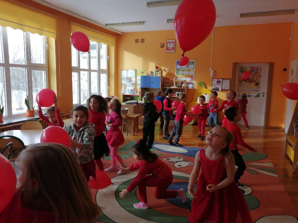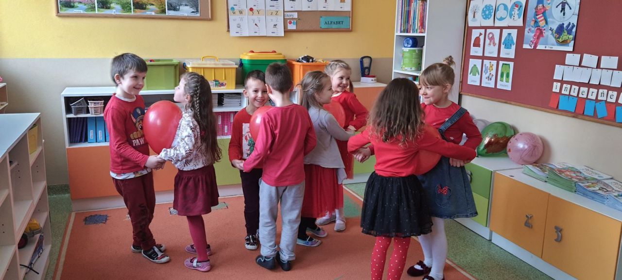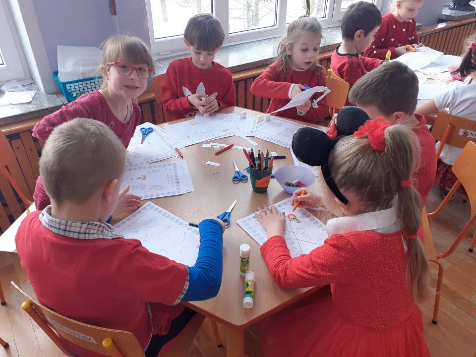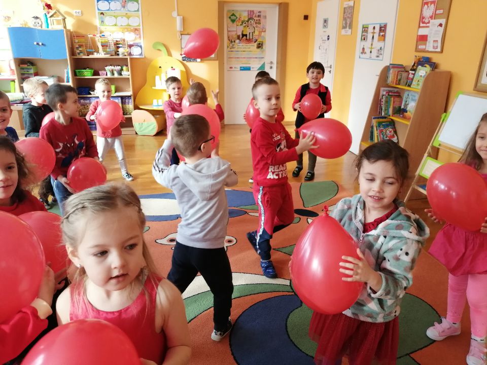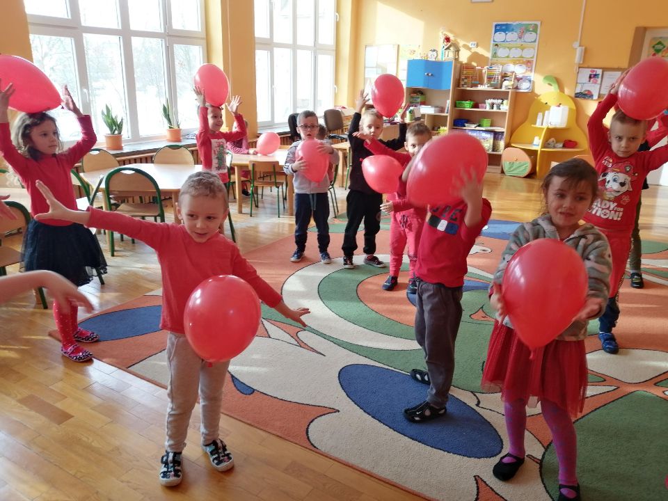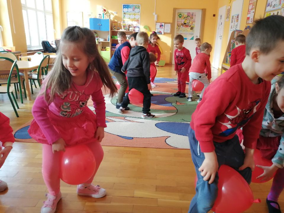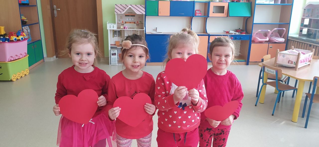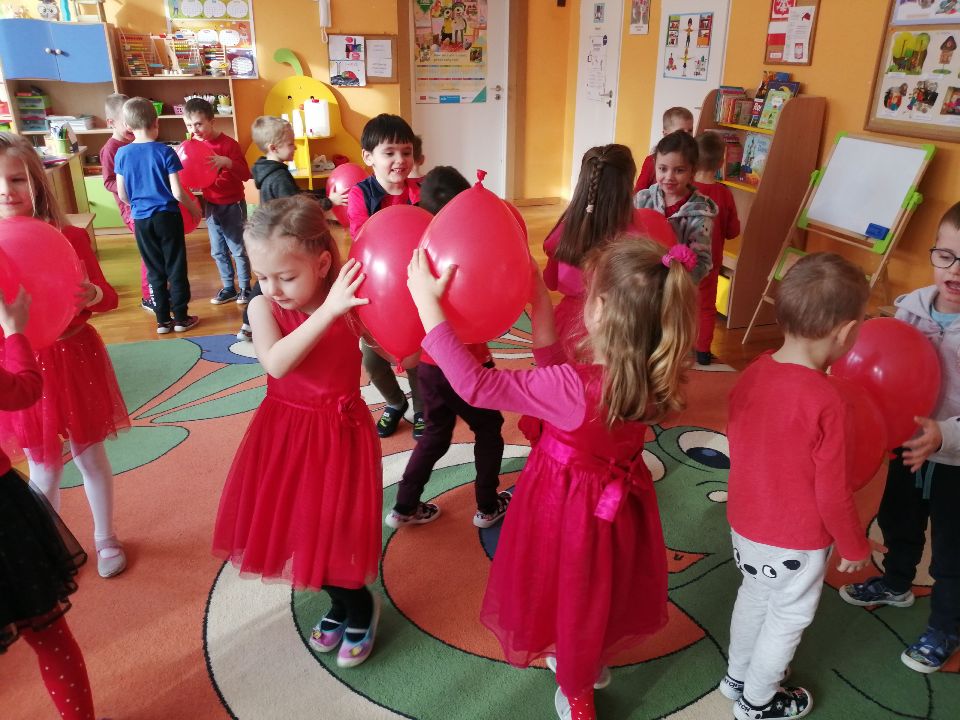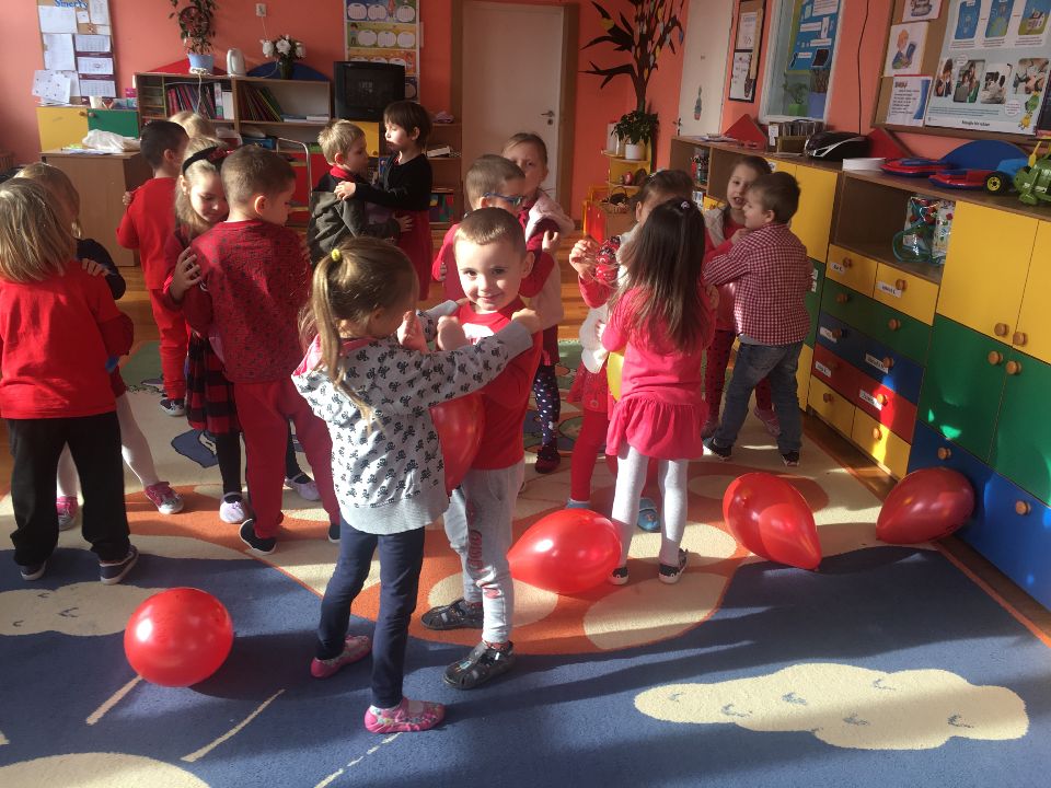 Jak co roku o tej porze, dzieci z całego przedszkola kultywowały tradycje walentynkowe. W pogodnej atmosferze i radosnym nastroju obchodziły ten dzień bardzo przyjemnie. Na początku zostały zaznajomieni ze zwyczajami walentynkowymi, ich historią i tradycją. Poznały również patrona tegoż święta, Świętego Walentego. Przedszkolaki przebrane w czerwone stroje wyklejały, rysowały i kolorowały serduszka, wykonywały laurki i prace plastyczne, by następnie wręczyć je jako walentynkę swoim kolegom, koleżankom oraz rodzicom. Prawiły sobie komplementy i mówiły miłe słowa. Wypowiadały swoje zdania, co według nich znaczy kochać kogoś i jak można to pokazać drugiej osobie. Uczestniczyły w zabawach ruchowych i tanecznych.