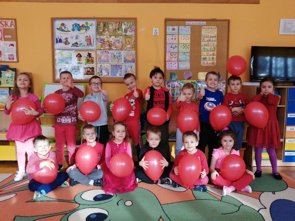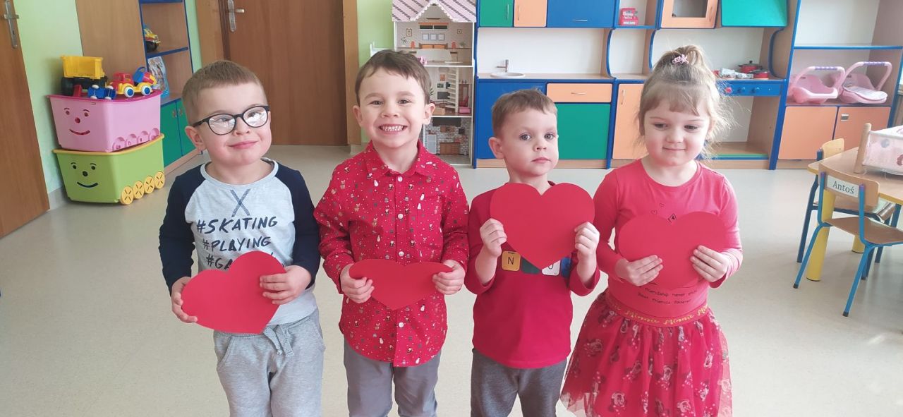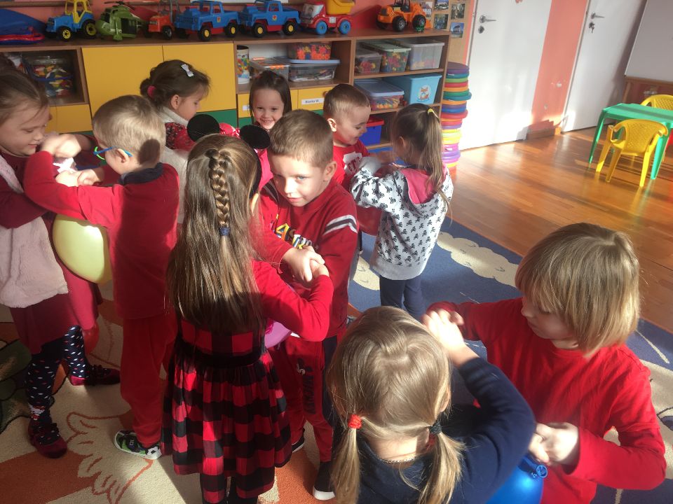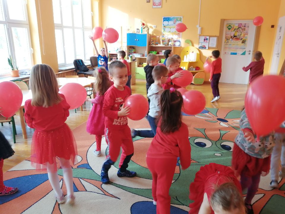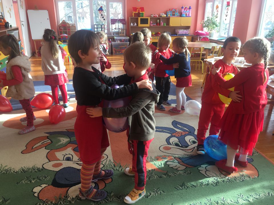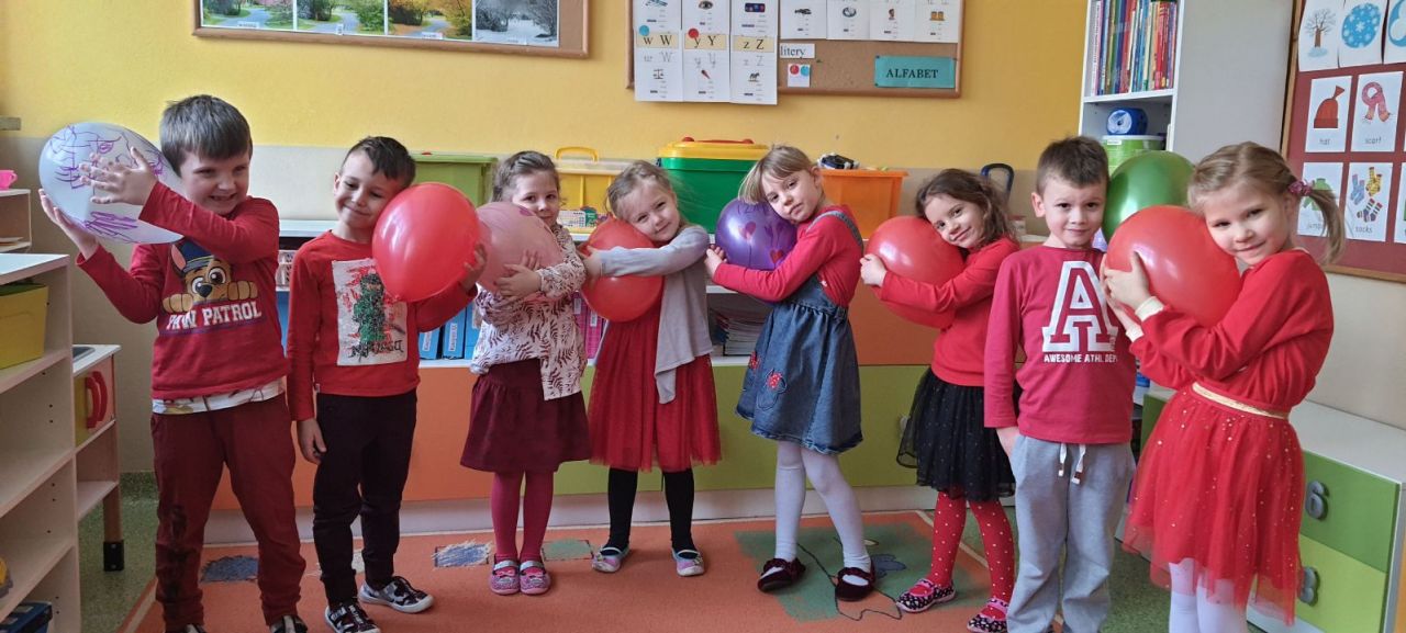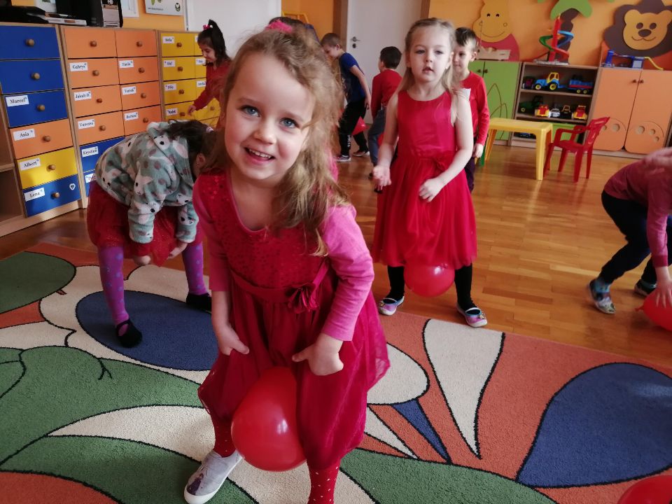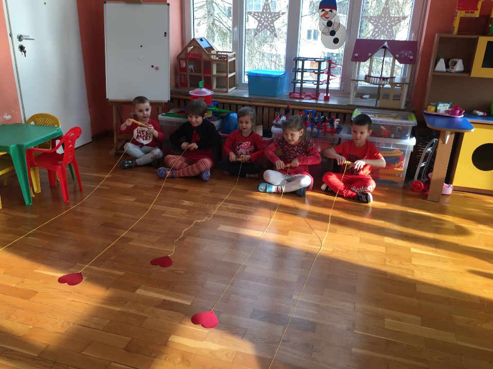 Jak co roku o tej porze, dzieci z całego przedszkola kultywowały tradycje walentynkowe. W pogodnej atmosferze i radosnym nastroju obchodziły ten dzień bardzo przyjemnie. Na początku zostały zaznajomieni ze zwyczajami walentynkowymi, ich historią i tradycją. Poznały również patrona tegoż święta, Świętego Walentego. Przedszkolaki przebrane w czerwone stroje wyklejały, rysowały i kolorowały serduszka, wykonywały laurki i prace plastyczne, by następnie wręczyć je jako walentynkę swoim kolegom, koleżankom oraz rodzicom. Prawiły sobie komplementy i mówiły miłe słowa. Wypowiadały swoje zdania, co według nich znaczy kochać kogoś i jak można to pokazać drugiej osobie. Uczestniczyły w zabawach ruchowych i tanecznych.