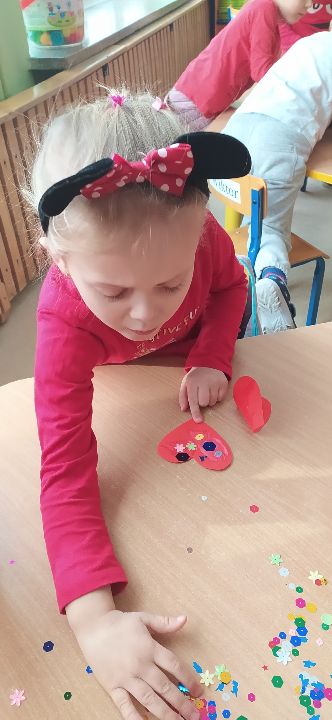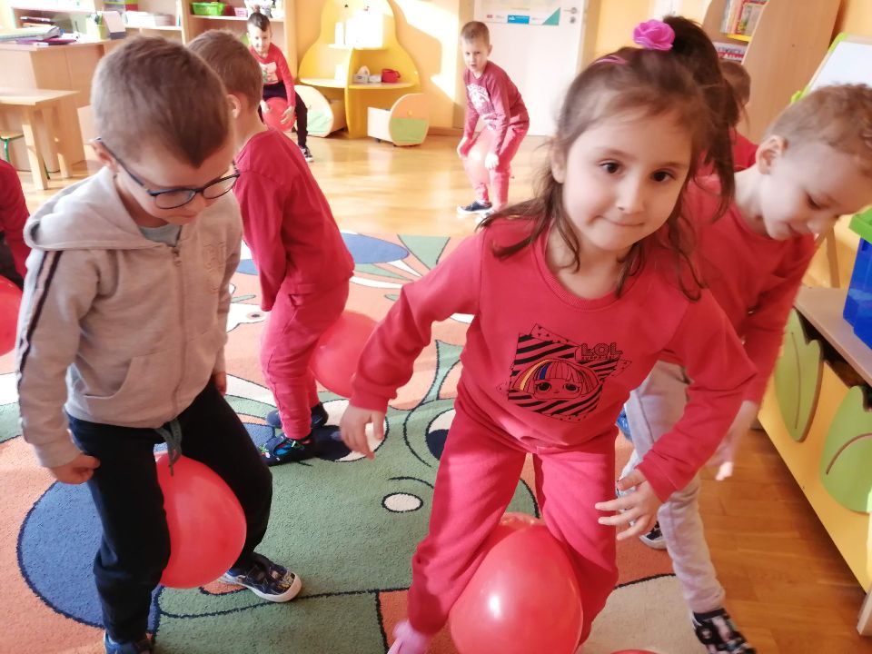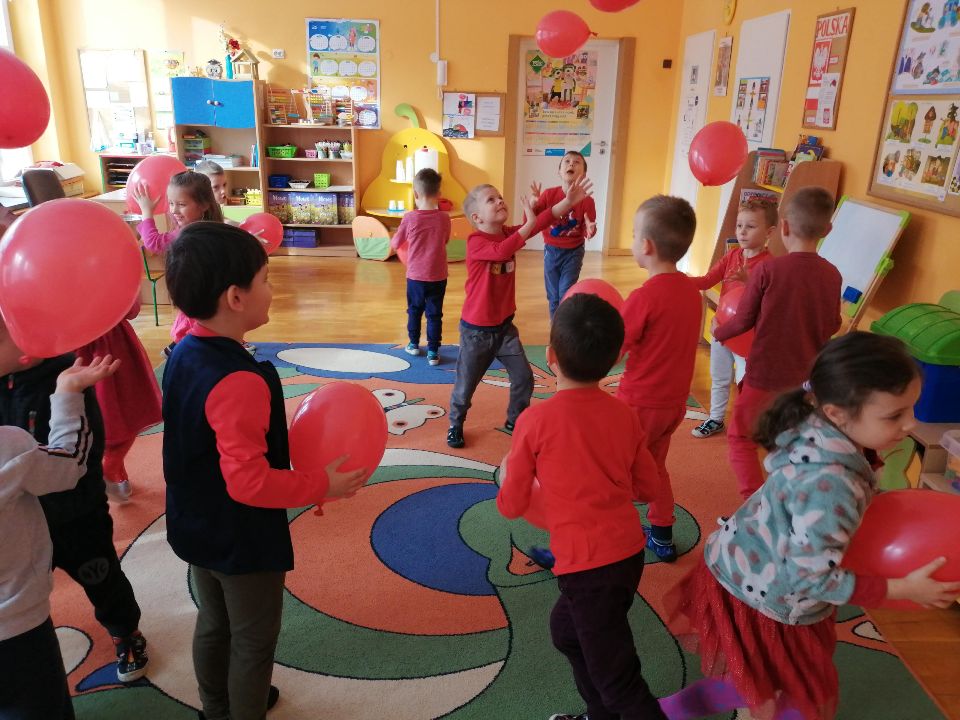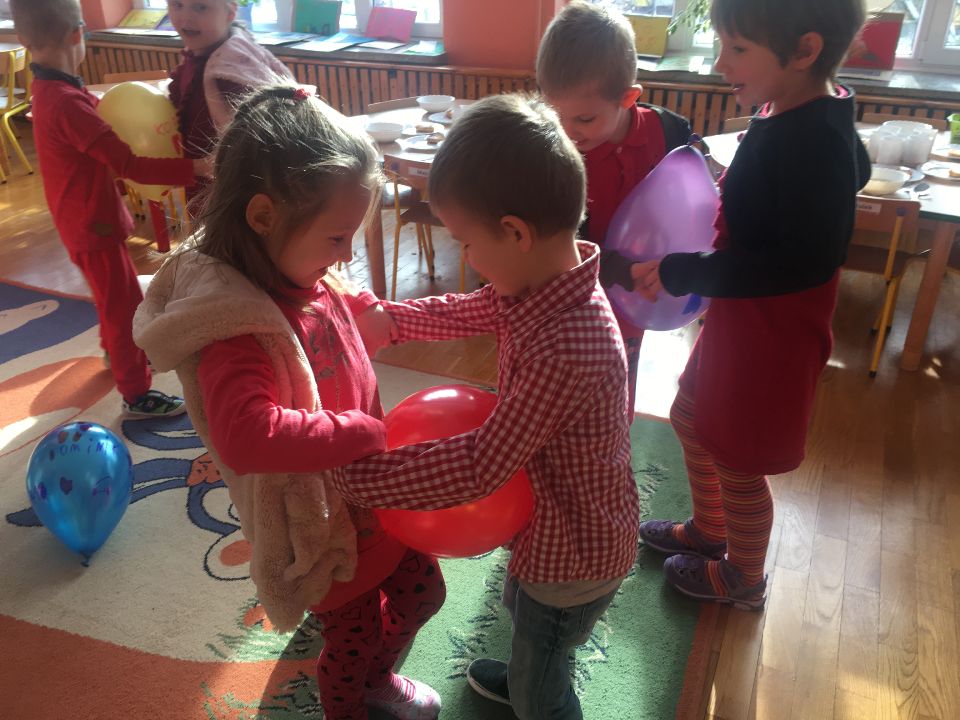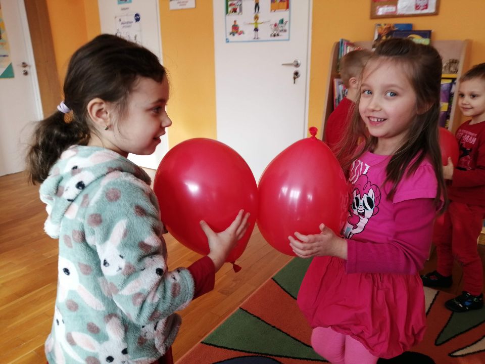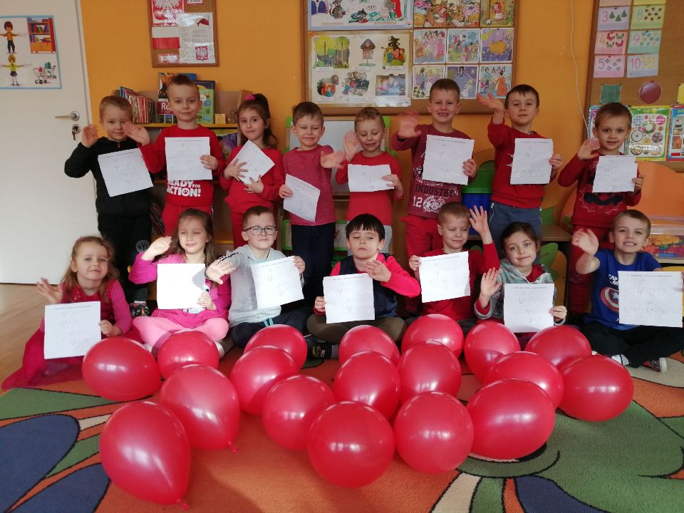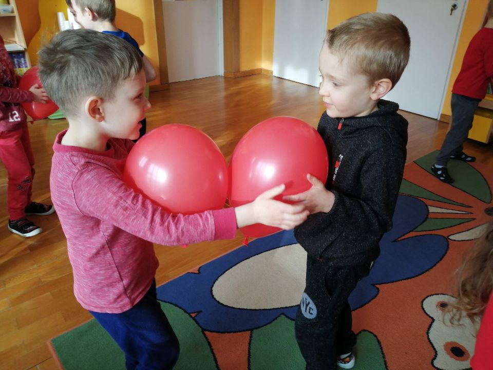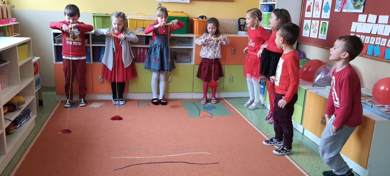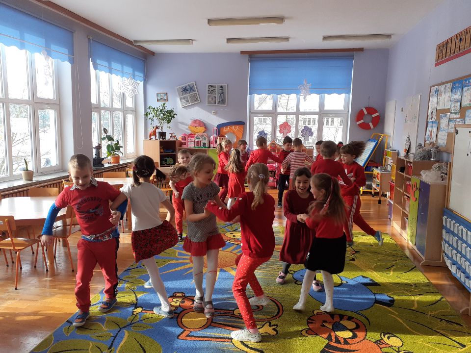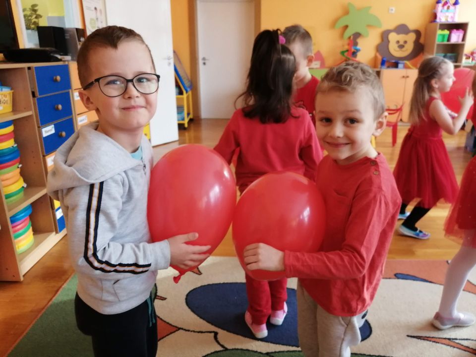 Jak co roku o tej porze, dzieci z całego przedszkola kultywowały tradycje walentynkowe. W pogodnej atmosferze i radosnym nastroju obchodziły ten dzień bardzo przyjemnie. Na początku zostały zaznajomieni ze zwyczajami walentynkowymi, ich historią i tradycją. Poznały również patrona tegoż święta, Świętego Walentego. Przedszkolaki przebrane w czerwone stroje wyklejały, rysowały i kolorowały serduszka, wykonywały laurki i prace plastyczne, by następnie wręczyć je jako walentynkę swoim kolegom, koleżankom oraz rodzicom. Prawiły sobie komplementy i mówiły miłe słowa. Wypowiadały swoje zdania, co według nich znaczy kochać kogoś i jak można to pokazać drugiej osobie. Uczestniczyły w zabawach ruchowych i tanecznych.