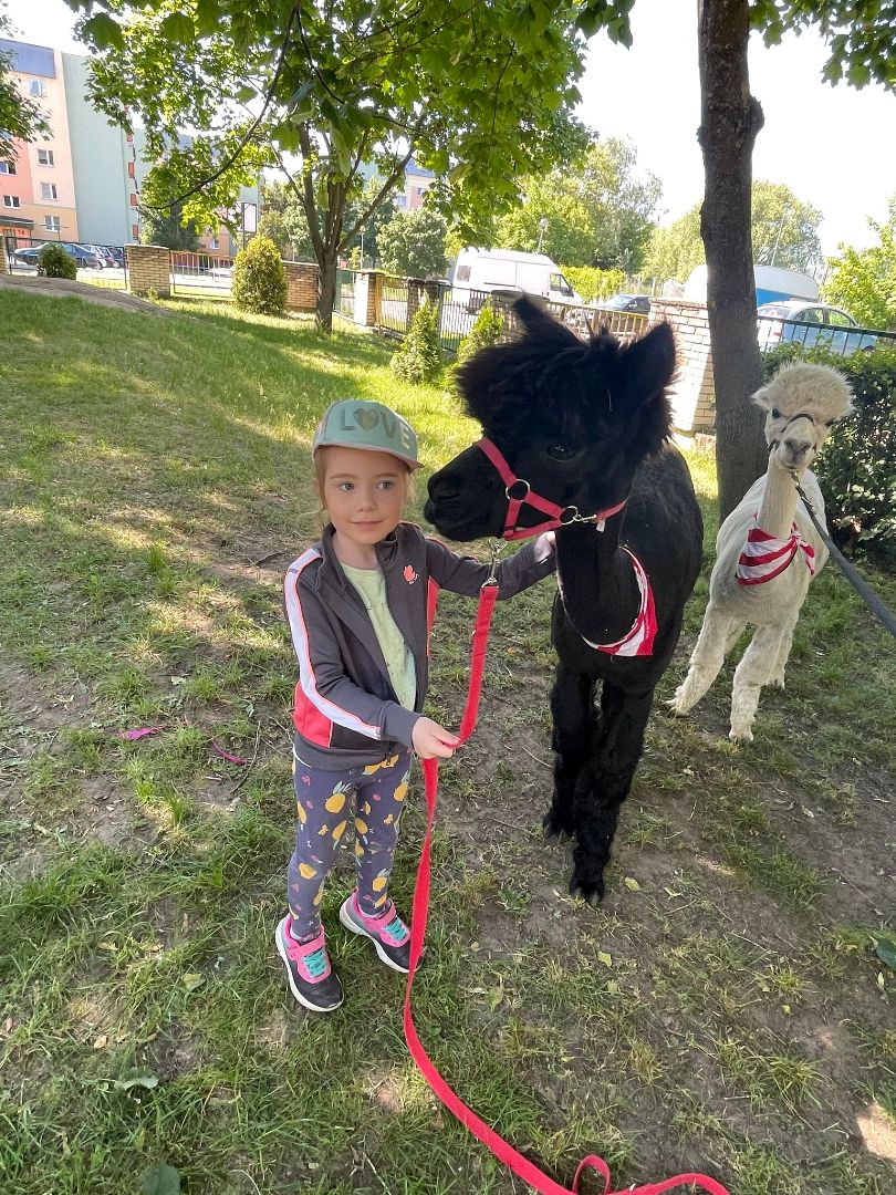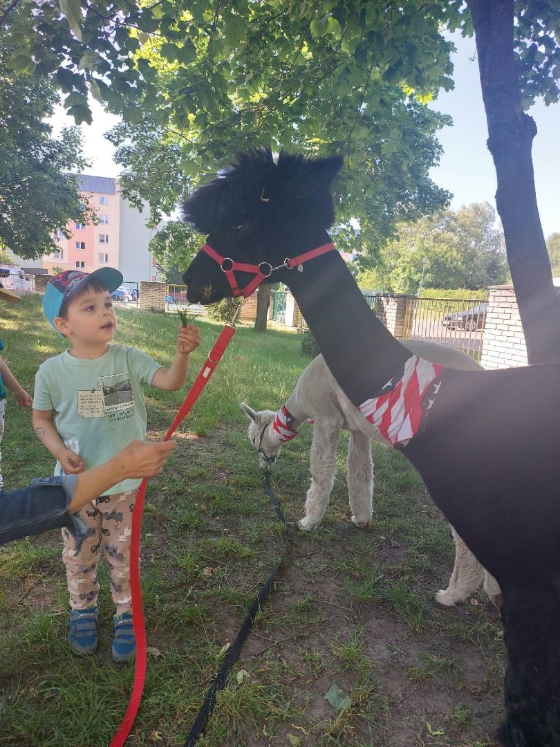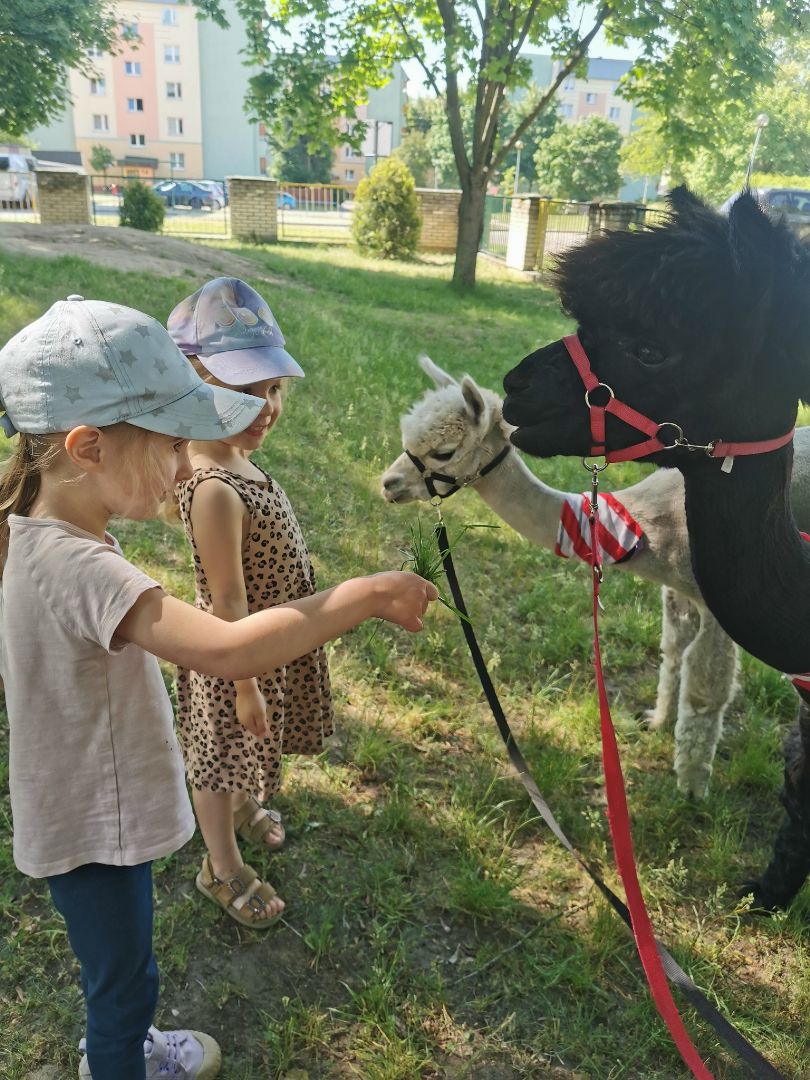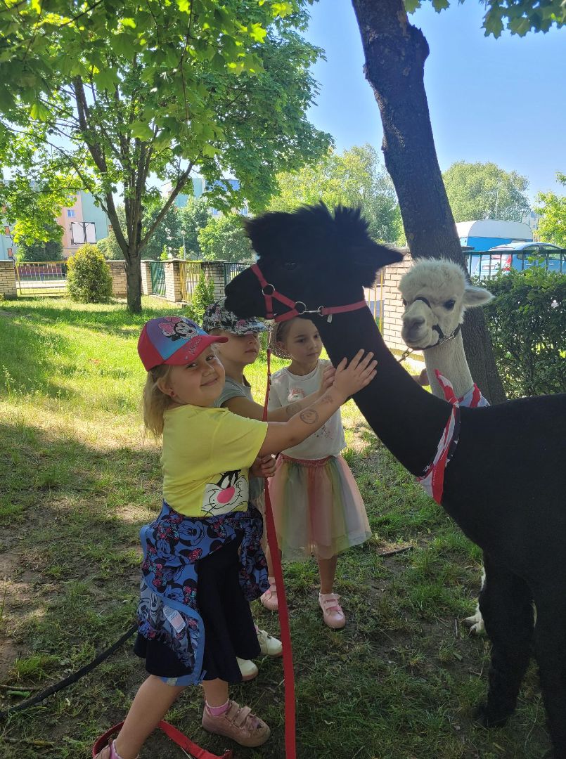 . Alpaki są to zwierzęta o bardzo łagodnym usposobieniu, płochliwe i delikatne, zupełnie pozbawione agresji. Szczególnie pozytywnie nastawienie wykazują w stosunku do dzieci ( dlatego są używane w terapiach dziecięcych). Spotkanie z alpakami było bardzo ciekawą lekcją edukacyjną, podczas której przedszkolaki poznały życie i zwyczaje tych przemiłych zwierząt, dowiedziały się, że alpaki są bardzo inteligentnymi, szybko uczącymi się zwierzętami z rodziny wielbłądowatych, wysłuchały też ciekawostek o alpakach. Każde dziecko miało możliwość nakarmienia uroczego zwierzątka. Wszystkie przedszkolaki były zachwycone ich wizytą