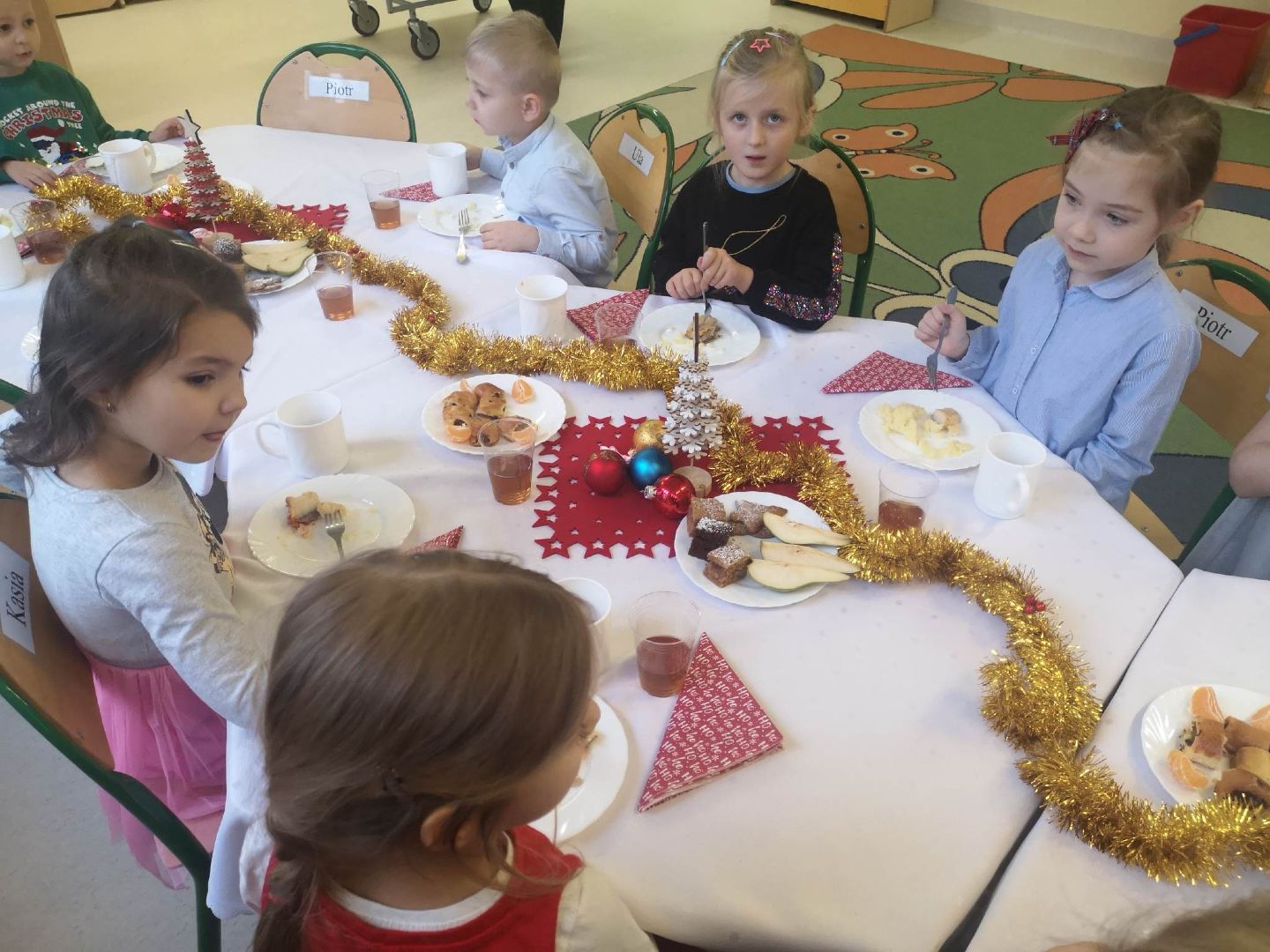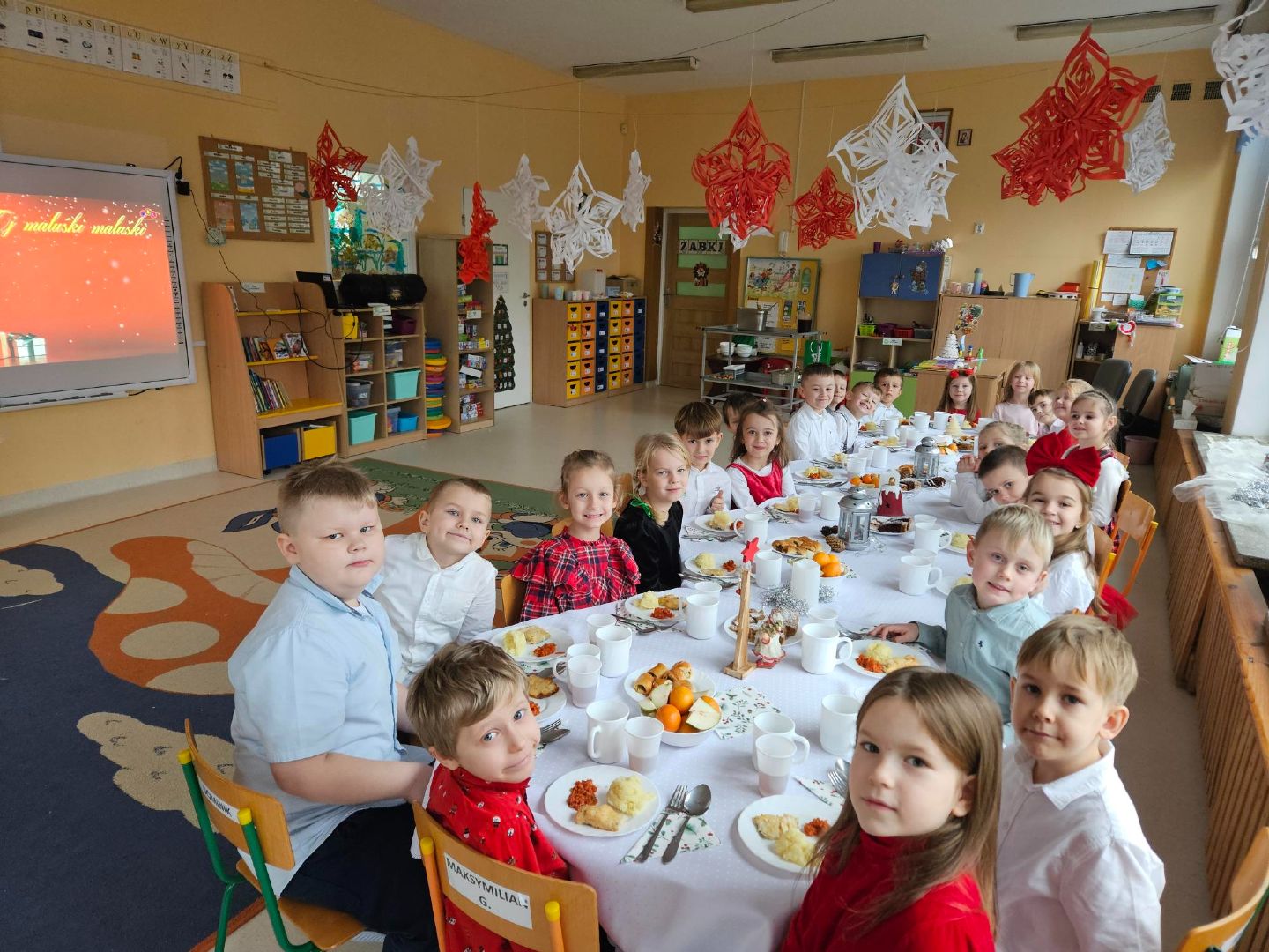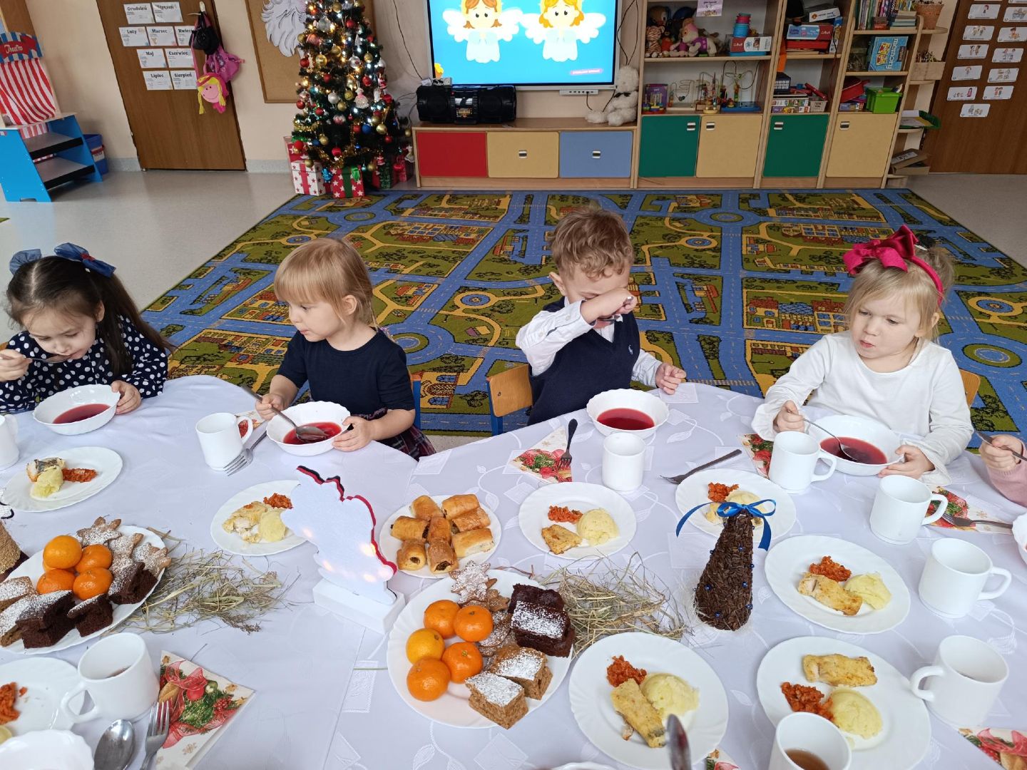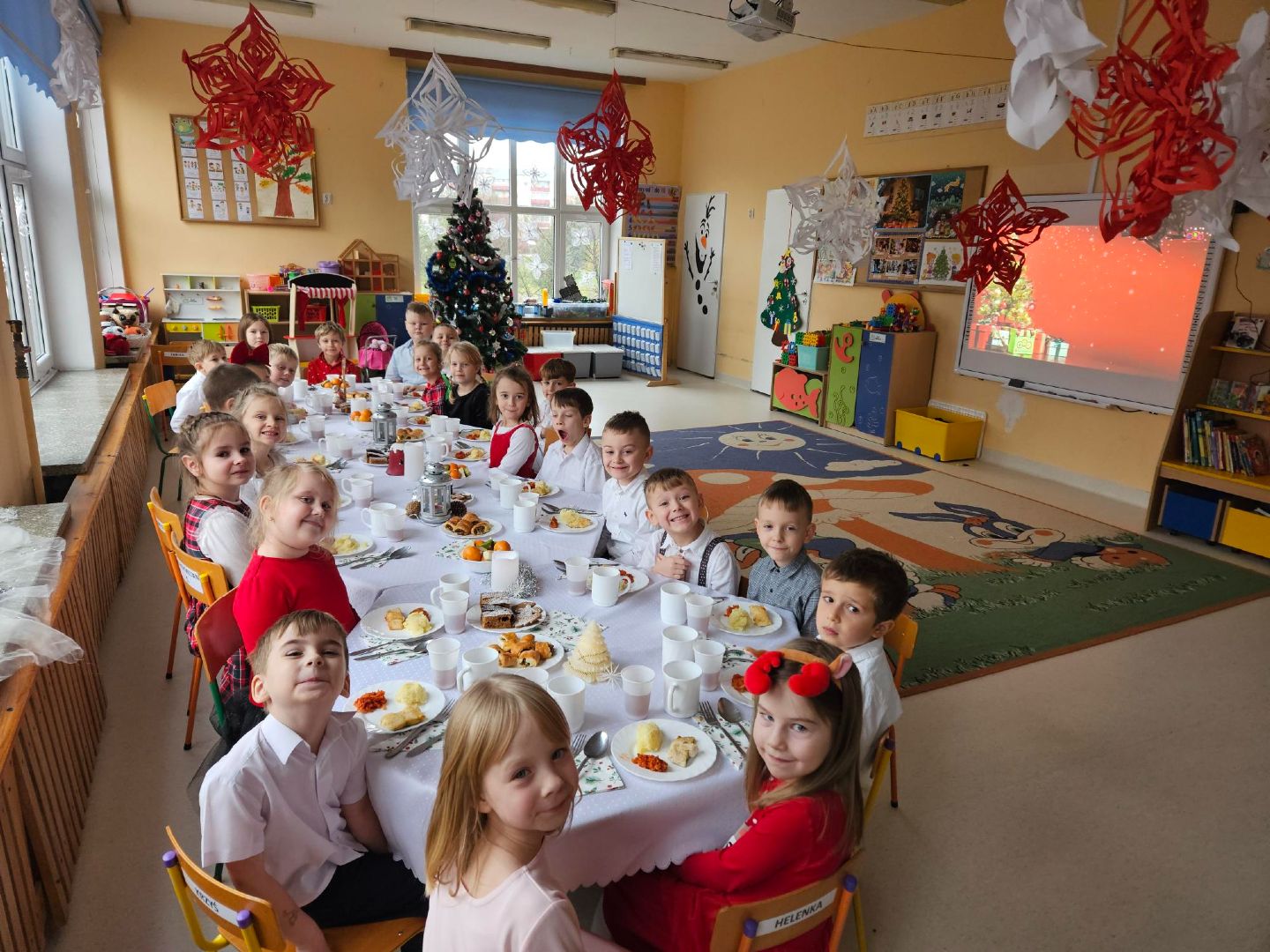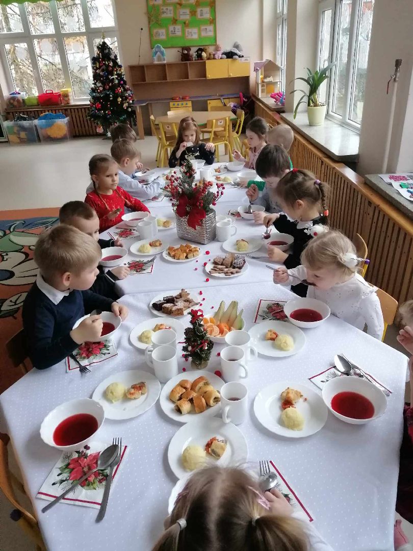to magiczny, radosny czas, spędzony w gronie najbliższych. Także w naszym przedszkolu nastał wspaniały moment- Wigilia. Dzieci wspólnie z Paniami kolędowały, dzieliły się opłatkiem, składały sobie życzenia i jadły wspólny świąteczny obiad przy pięknie udekorowanym stole. Takie podniosłe chwile nie tylko utrwalają dzieciom znajomość tradycji i zwyczajów świątecznych lecz również, co najważniejsze wzmacniają bliskie serdeczne relacje.