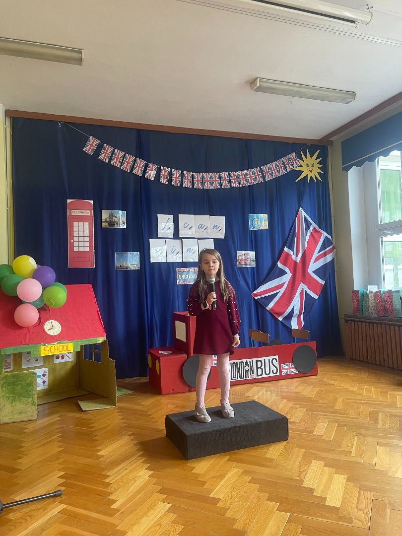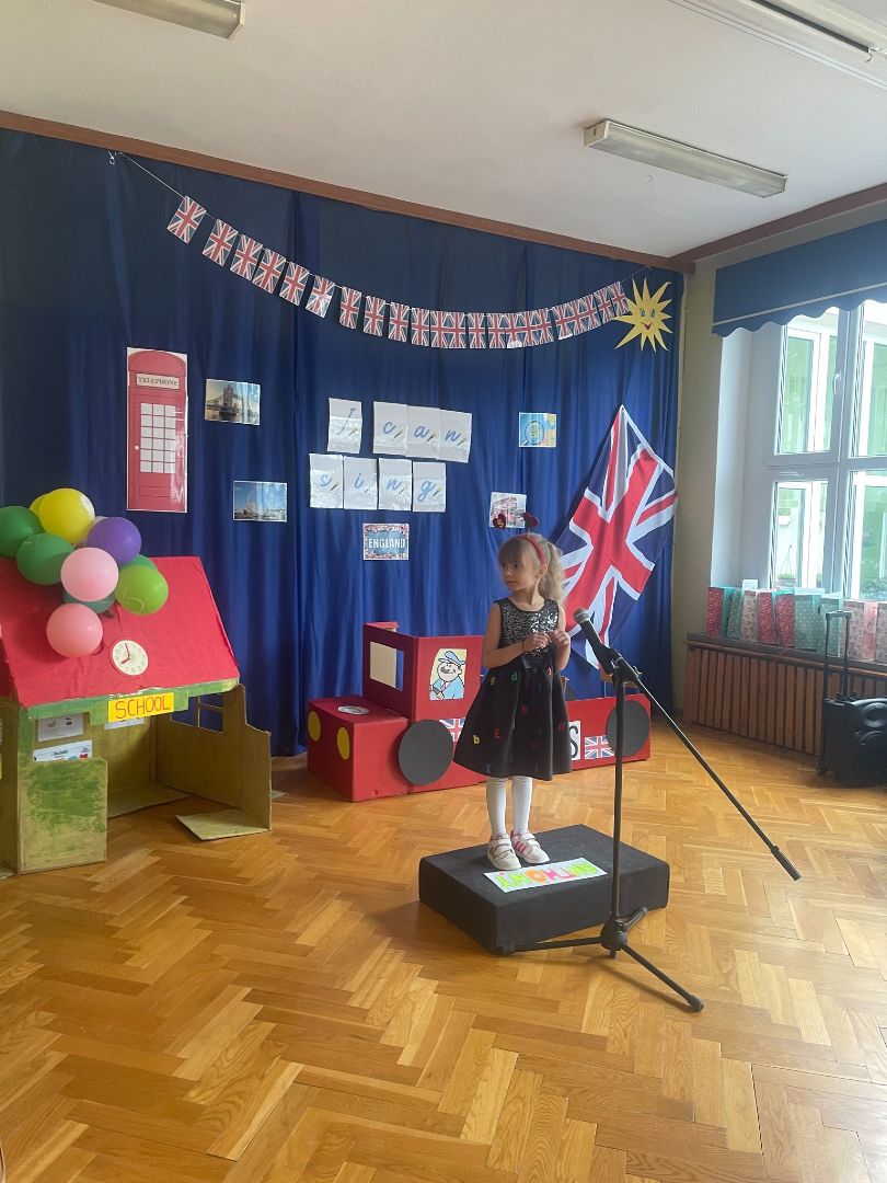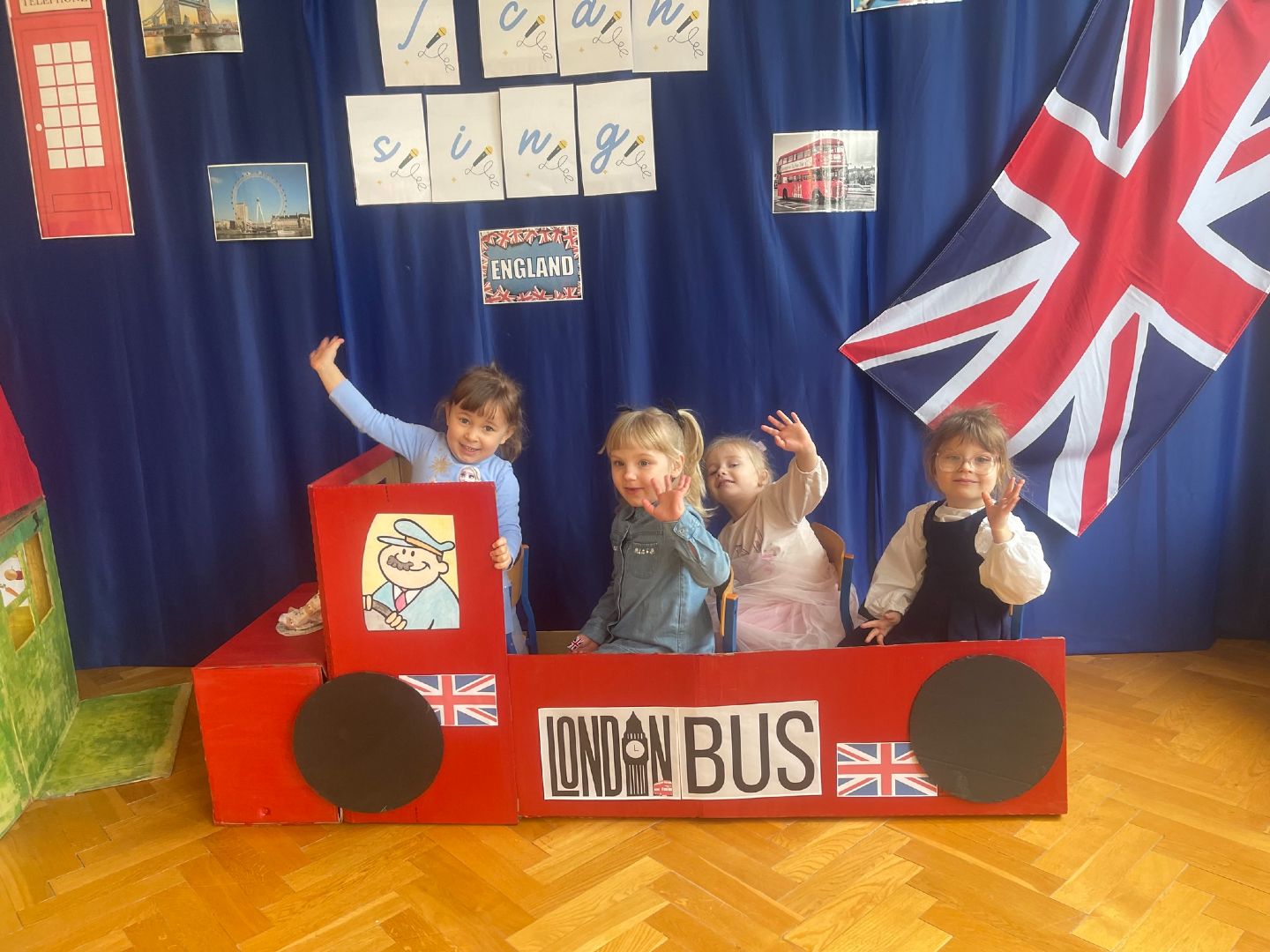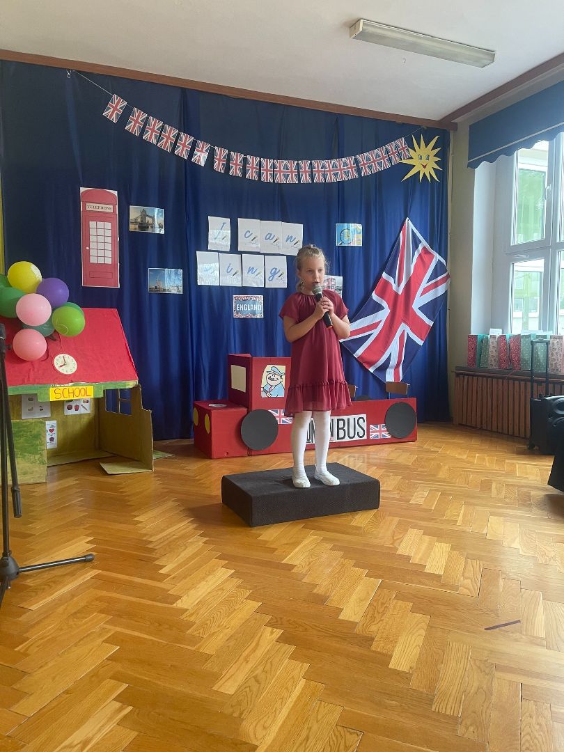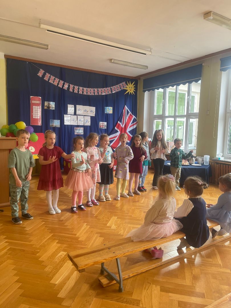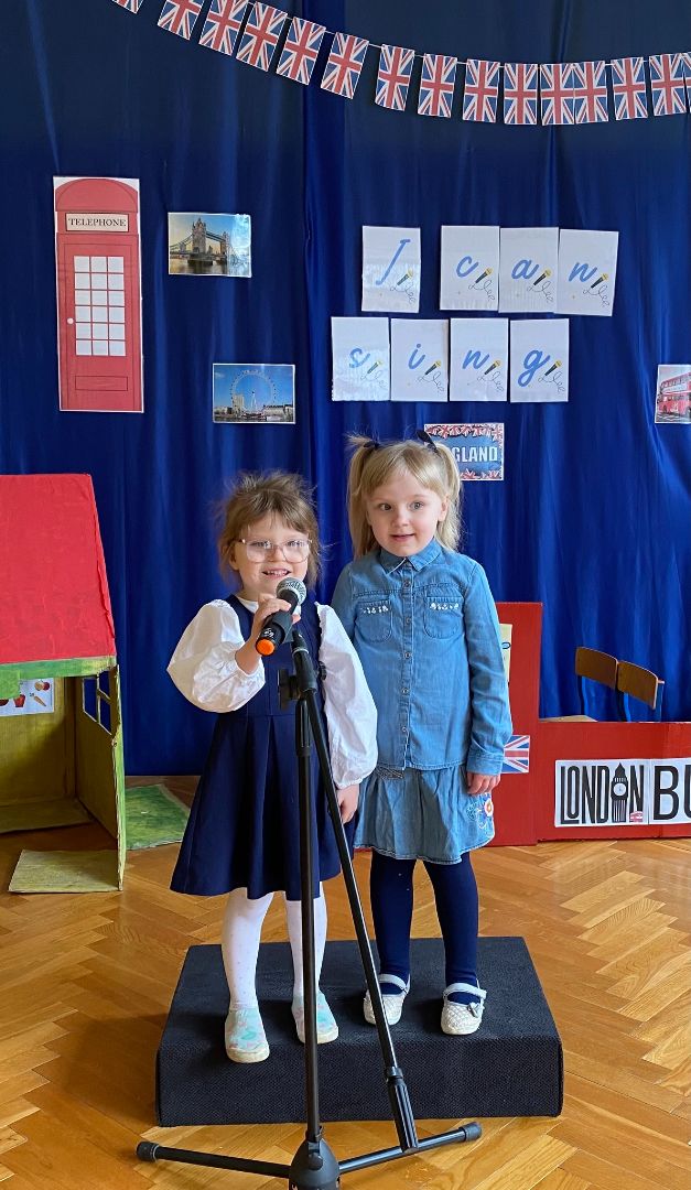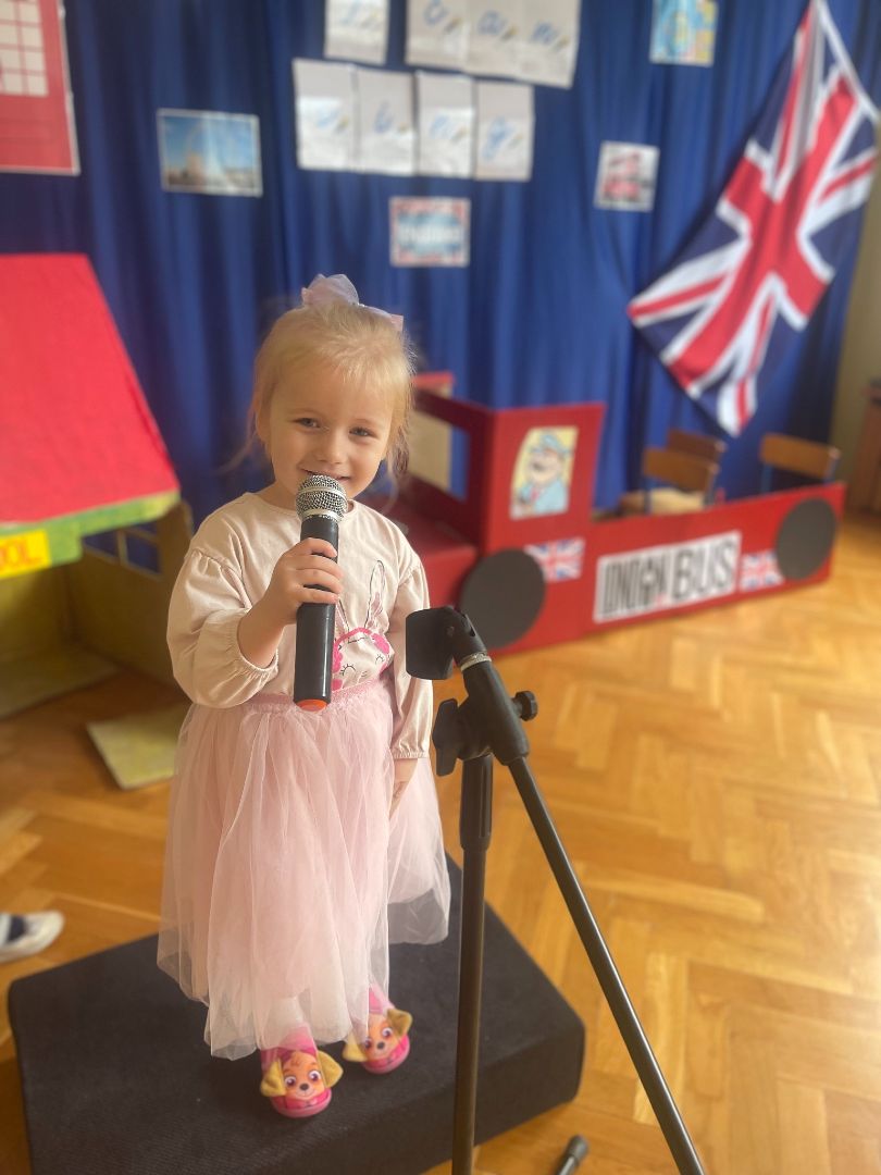 Dzieci śpiewają piosenkę "Wheels on the bus" Lena i Zosia podczas występu konkursowego Amelka podczas występu konkursowego Anastazja i Zosia podczas występu konkursowego Michalina podczas występu konkursowego Natalka i Luiza podczas występu konkursowego Lena podczas występu konkursowego Antosia podczas występu konkursowego Występ starszaków z grupy "Żabek"