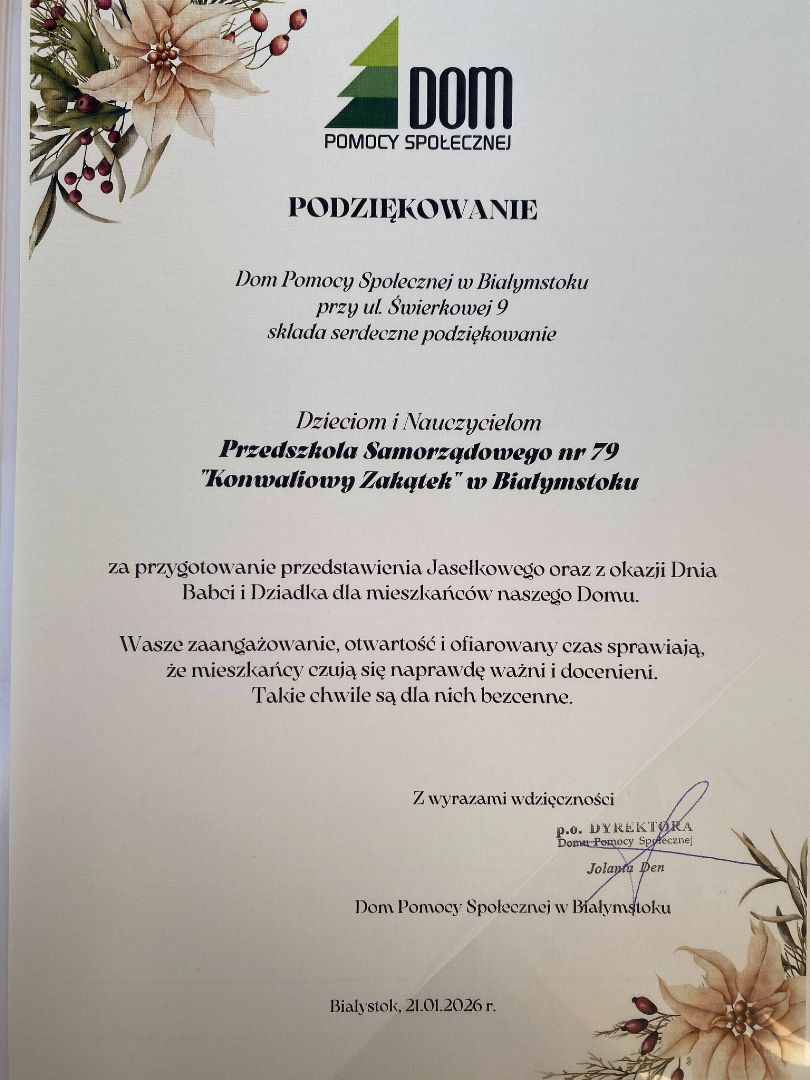 Nasi mali artyści zaprezentowali piękny występ jasełkowy 🎄⭐ a także przekazali herbatki zebrane w ramach akcji „Herbatka dla Seniora” ☕🎁. Serdecznie dziękujemy wszystkim, którzy włączyli się w tę inicjatywę 🤍 – dzięki Wam te drobne upominki umilą seniorom mroźne, zimowe wieczory ❄️🔥 i dodadzą im ciepła oraz uśmiechu ☺️